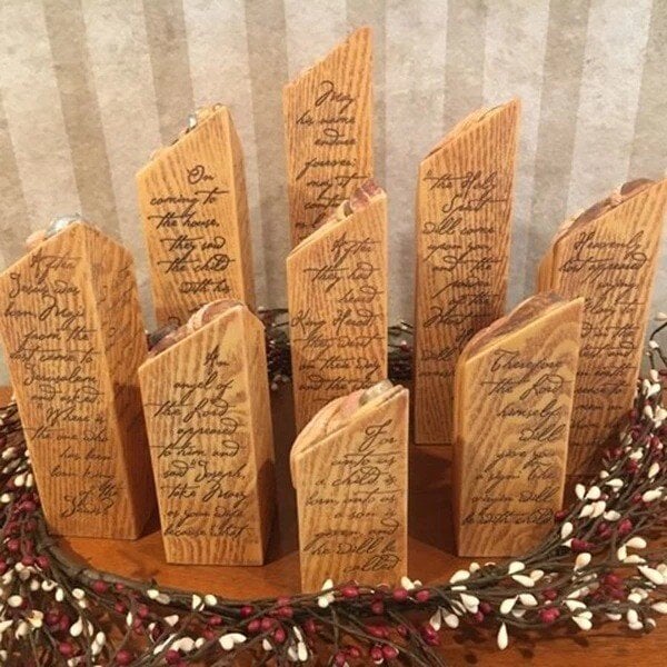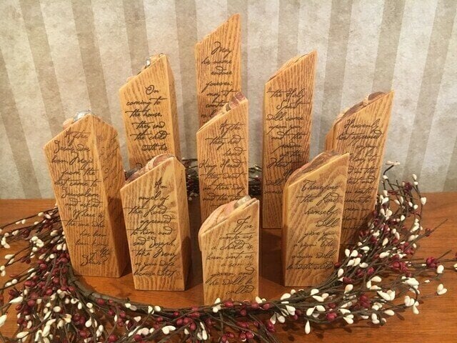 ❥ [Nativity Story] Nine diamond-shaped ornament tell the nativity story in a way both traditional and new. Cast in resin finished looking like wood, this dramatic Nativity is modern yet reverent; inscribed on the back of each ornament is a Bible passage.